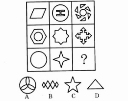 第一題,圖形比較規則、整齊,考查對稱性,即中心對稱圖形。選擇B項。