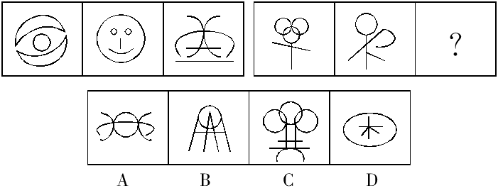 觀察這類題的特點,每個圖形相似度不高,且所有圖形是由清晰、簡單的直線或曲線線條組成,因此考查數(shù)量關(guān)系,并且首先考慮線條的數(shù)量。每個圖形線條數(shù)均為5,D選項符合。且左邊三個圖形的曲直線條數(shù)目分別為5、4、3和0、1、2,選項中曲直線條數(shù)目應分別為3、2、1和2、3、4。