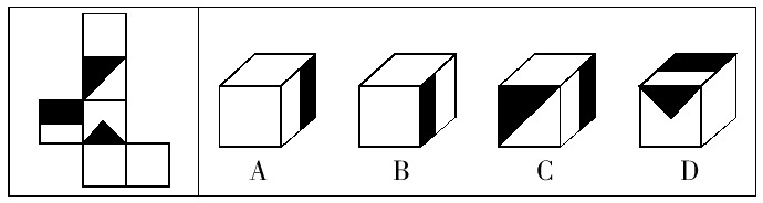 這類題屬于空間推理題,平面圖形的折疊圖和立體圖形的展開圖常需要考生具備一定的空間想象能力。本題中黑色長方形的陰影邊和黑色大直角三角形的陰影邊相鄰,故排除B項和C項;黑色小直角三角形的陰影邊所相鄰的面是空白面,故排除D項。A項可由題干圖形折成。