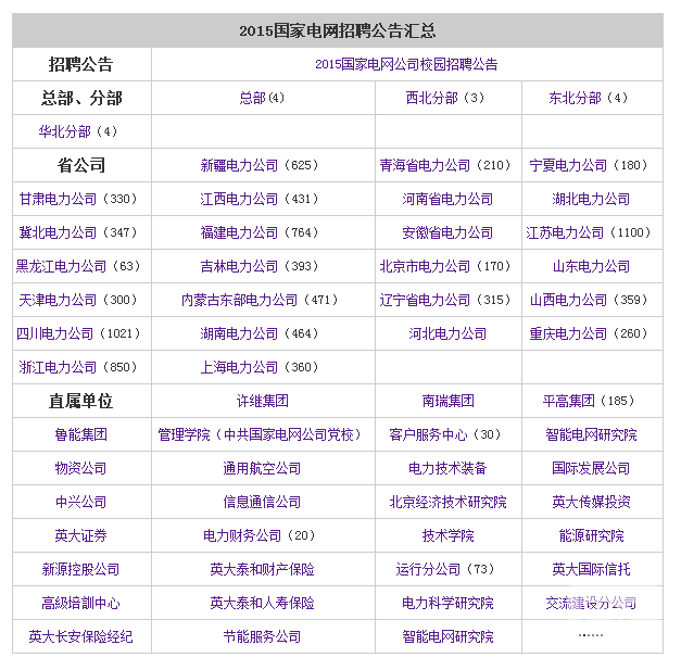 2015國家電網各公司校園招聘公告已經發布,此次招聘采取網上報名的方式,目前大部分公司正處于報名階段,各省公司和直屬單位招聘的批次和報名的截止時間各不相同。