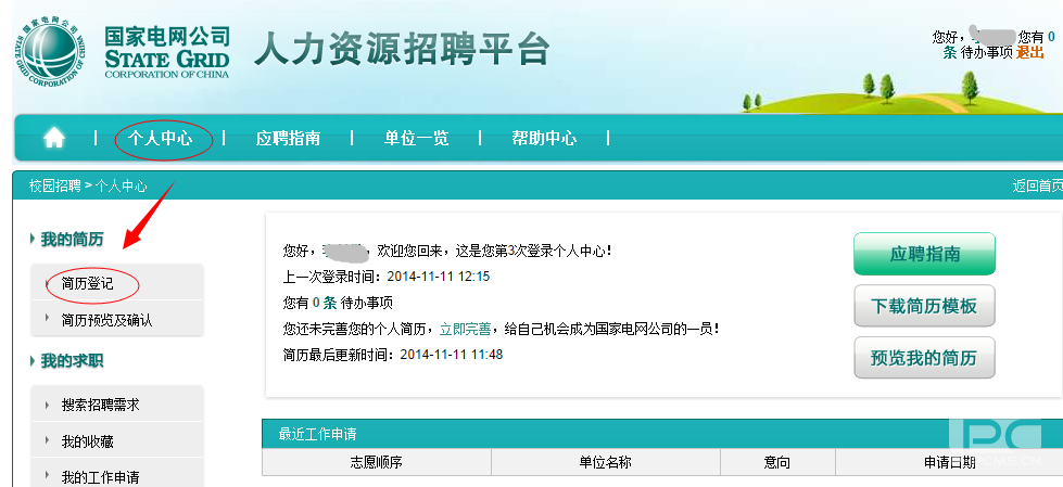 三、注冊后,需在“個人中心”中填寫簡歷,填寫的內容比較多,防止時間過長提交過程需重新登陸,建議先“下載簡歷模板”,本地填好信息后再到系統中。
