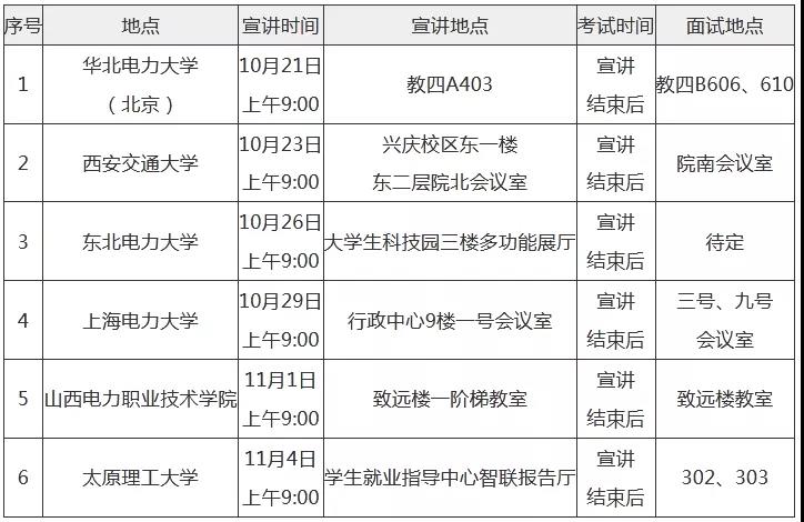 根據(jù)國網(wǎng)山西省電力公司2021年招聘工作安排,我公司將開展校園招聘,具體安排如下:本次校園招聘優(yōu)先招聘博士研究生、985、211工程院校和原電力部屬院校(含上海電力學院、南京工程學院、三峽大學、長沙理工大學、沈陽工程學院、東北電力大學)電工類(含電力系統(tǒng)及其自動化、電氣工程、高電壓與絕緣技術(shù)、繼電保護、電力電子與電力傳動等)碩士研究生,985工程院校計算機科學與技術(shù)、信息與通信工程專業(yè)碩士研究生。對于不屬于校園招聘范圍的畢業(yè)生,我公司將于網(wǎng)上報名時間截止后,對網(wǎng)上報名考生組織簡歷篩選和資格審查,合格者將通知參加國家電網(wǎng)公司統(tǒng)一考試,請應聘畢業(yè)生及時關(guān)注招聘平臺信息。2020年10月21日至11月4日,歡迎符合招聘條件的畢業(yè)生參加我公司校園招聘。具體行程安排詳見下表: