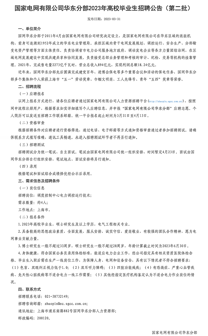 國家電網有限公司華東分部2023年高校畢業生招聘公告(第二批)