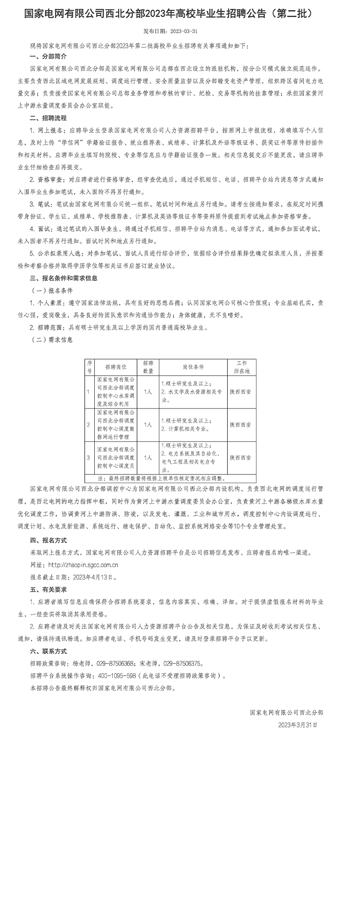 國家電網有限公司西北分部2023年高校畢業生招聘公告(第二批)