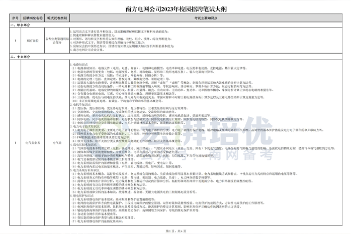 筆試由南方電網公司統一組織實施。筆試范圍包括綜合知識(40%)和專業知識(60%),其中專業知識考試內容按照招聘崗位對應的筆試試卷類別進行劃分。